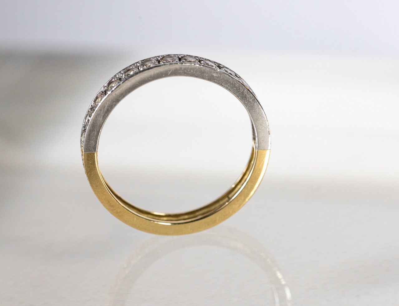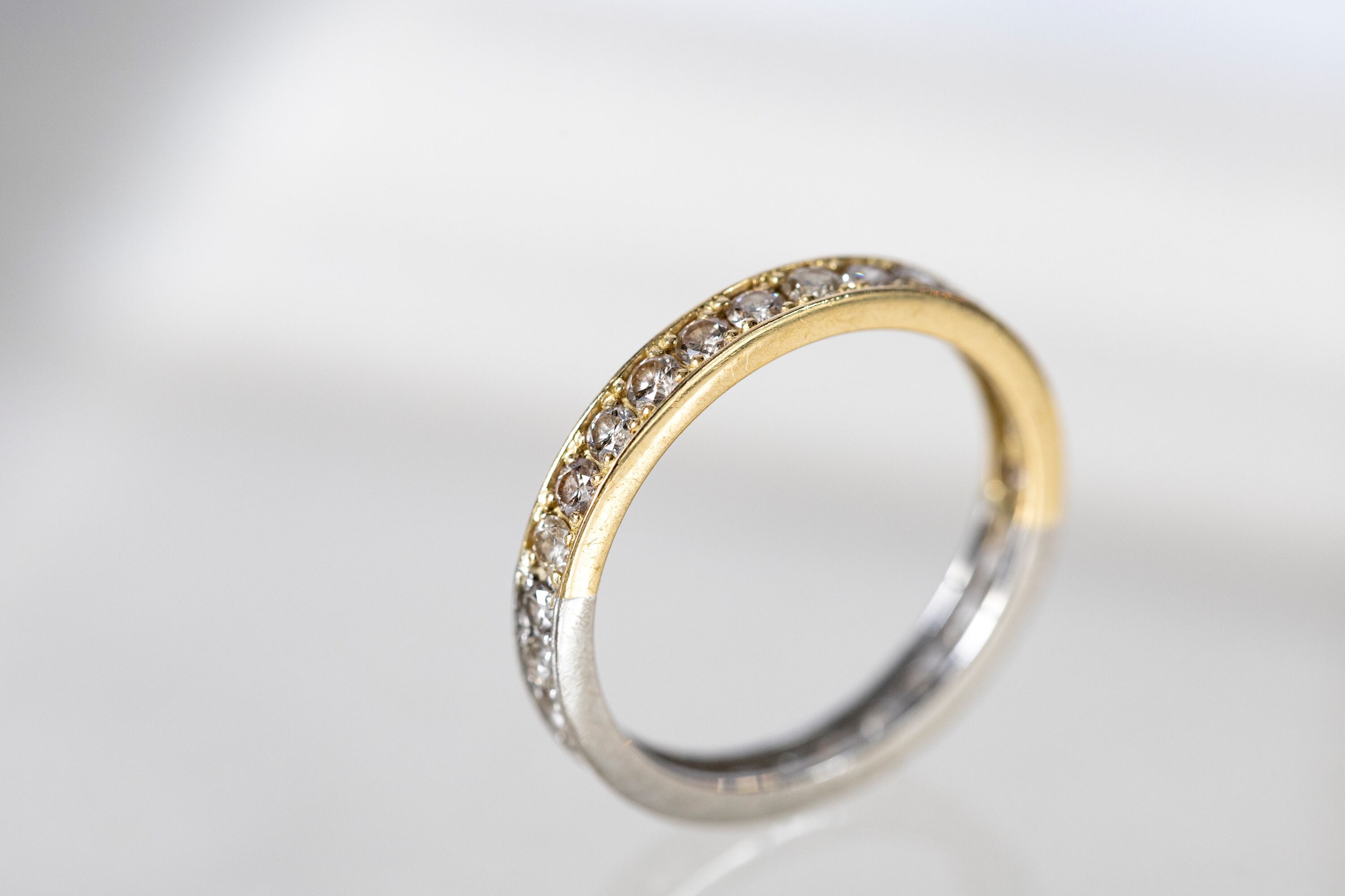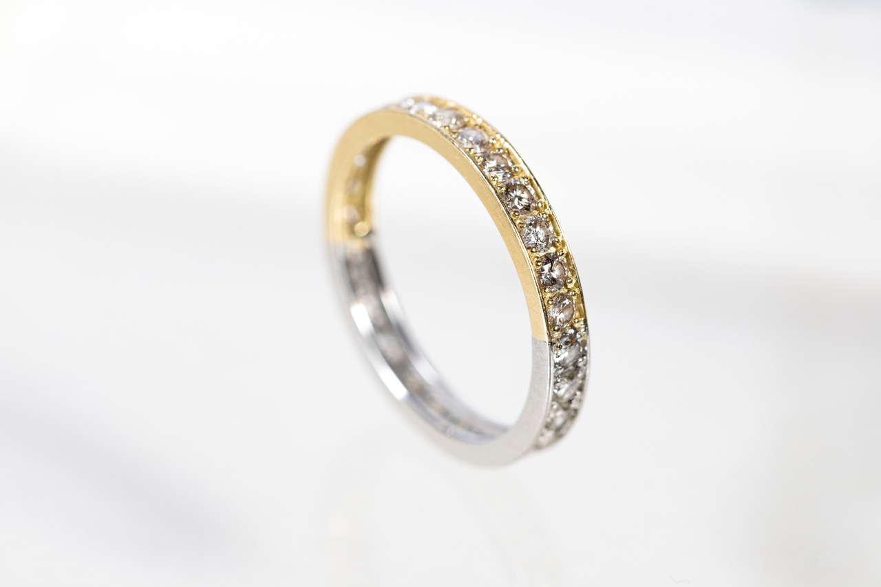 ゴールドとプラチナが一体となった、フルエタニティ。ダイヤモンドの輝きが永遠に続く指輪です。